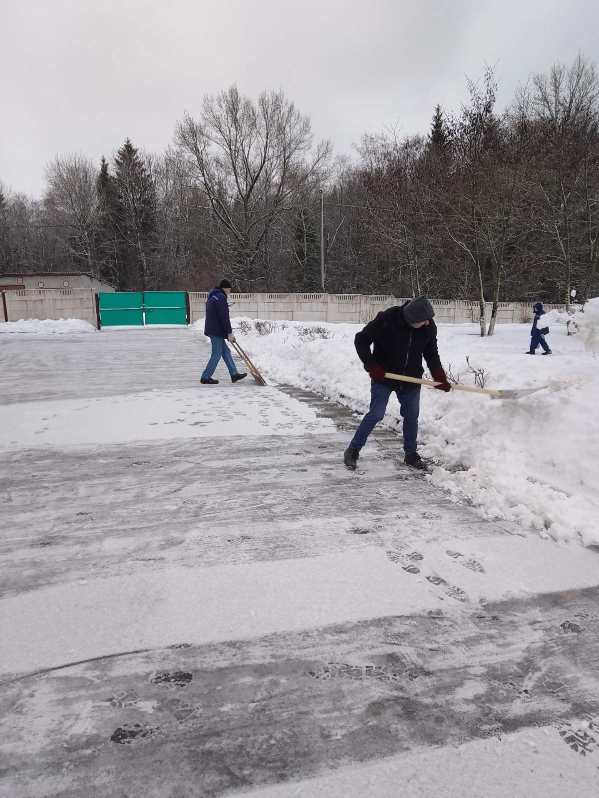 расчищают от снега и наледи ежедневно. Проживающие в рамках трудотерапии, а